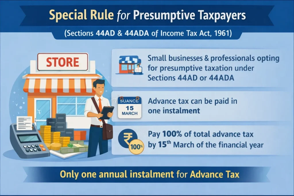 Taxpayers opting for presumptive taxation under Sections 44AD or 44ADA (small businesses/professionals) can pay their entire advance tax (100%) in one installment on or before 15th March 2026.