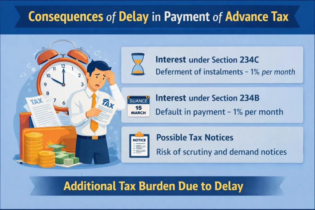 Timely payment of advance tax is a statutory obligation. Delay or short payment may lead to financial implications in the form of interest and possible notices from the Income Tax Department.