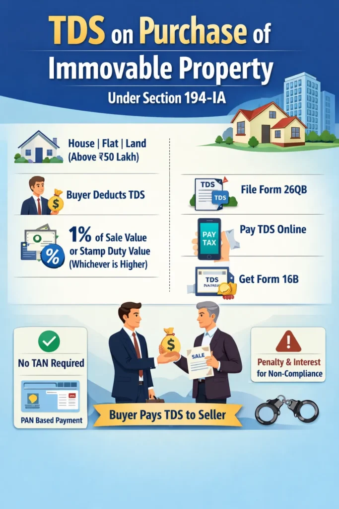 When purchasing immovable property (other than agricultural land) for ₹50 lakh or more, the buyer must deduct 1% TDS and deposit it using Form 26QB. After payment, Form 16B (TDS Certificate) must be issued to the seller.