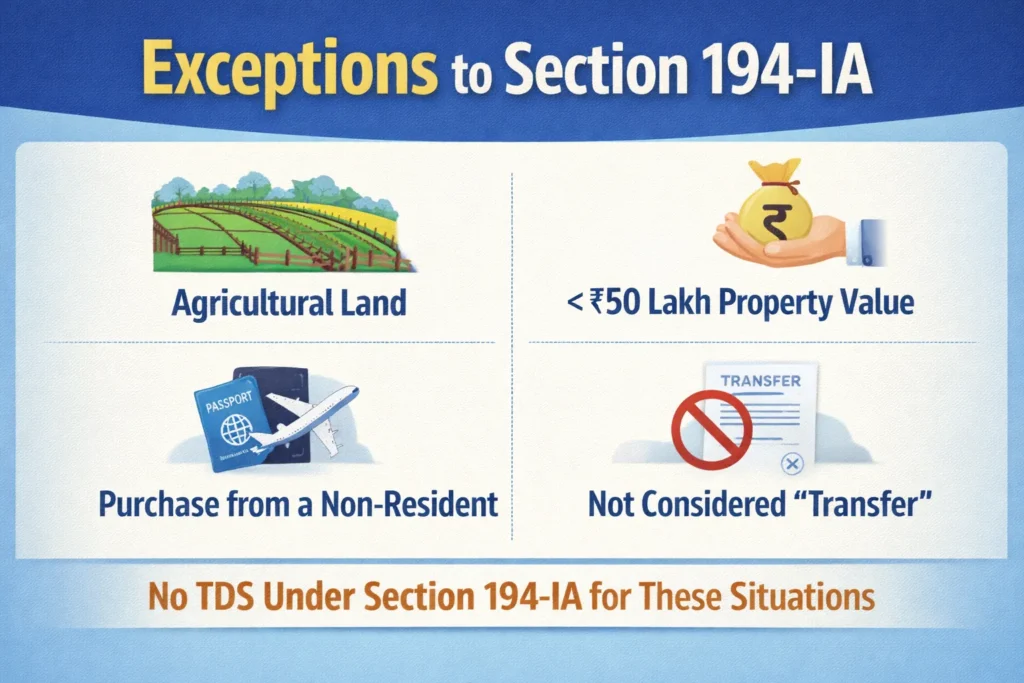 While Section 194-IA of the Income-tax Act, 1961 mandates TDS on the purchase of immovable property, the following situations are not covered under this section: